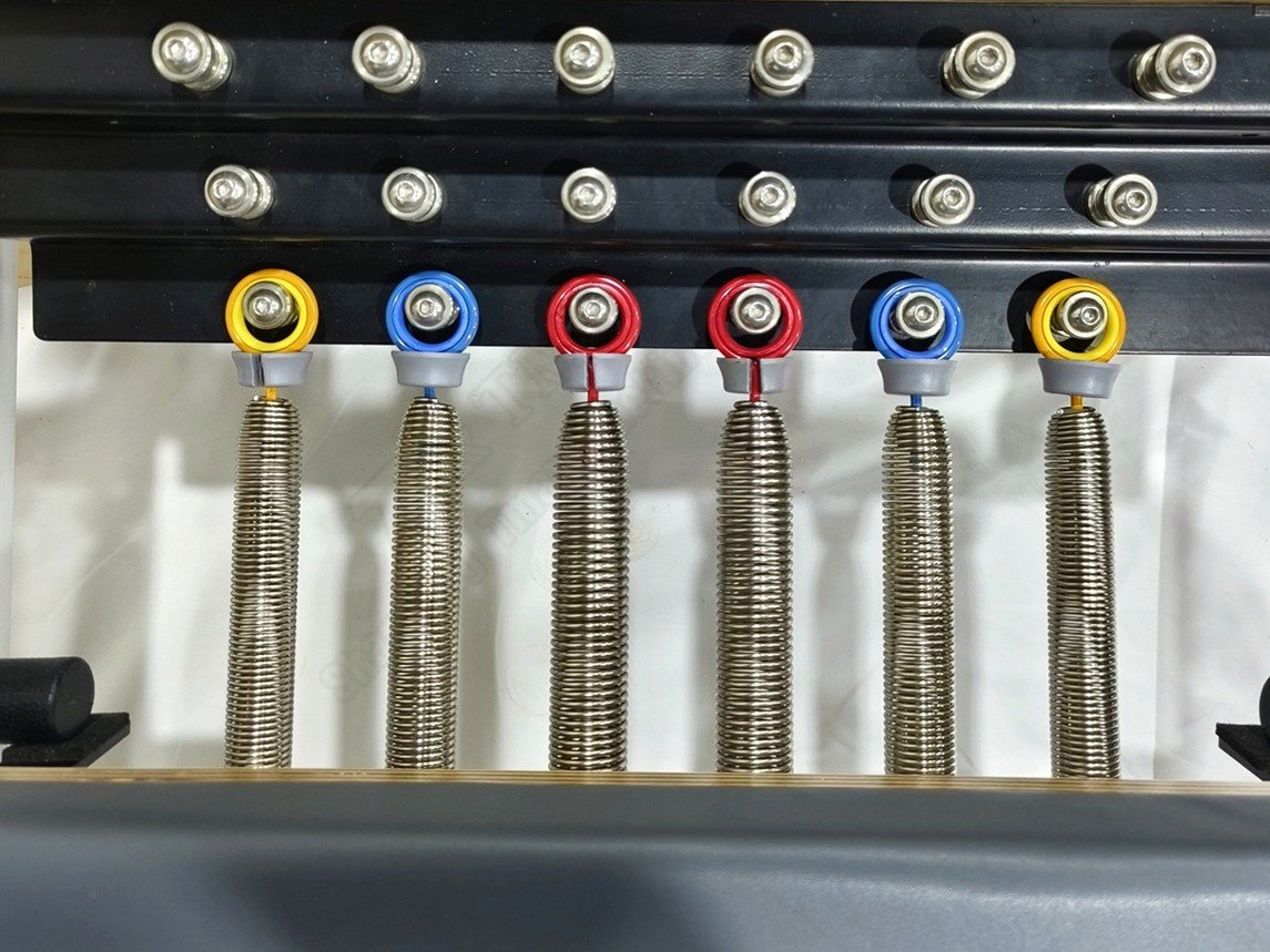 El color en los resortes no responde a un capricho estético: representa distintos niveles de resistencia para calibrar la intensidad del movimiento, según el objetivo del ejercicio y la condición del alumno.